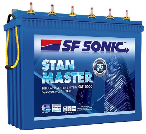 STAND MASTER – 150 AH TALL TUBULAR BATTERY WARRANTY – 36+18 MONTHS SPECIALLY DESIGNED FOR INVERTER. SF SONIC BRAND, MANUFACTURE EXIDE INDUSTRIES LTD.